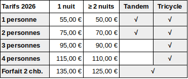 Il nous tient à cœur de maintenir notre tarif de base pour les gens qui voyagent seul. L’augmentation de 5 € sera donc reportée sur la part ajoutée par personne supplémentaire, ainsi que sur le tarif pour 2 nuits et plus.