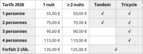 – Taxe de séjour : + 0,88 € / adulte / nuit (tarif 2026)